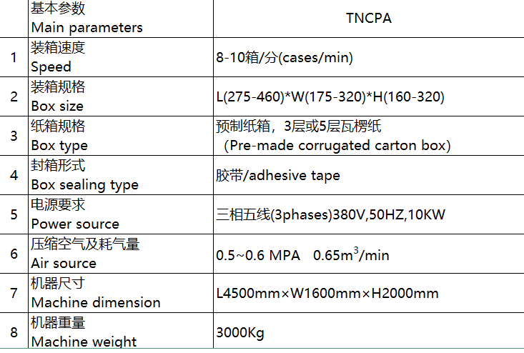 · 整機(jī)采用PLC及伺服電機(jī)作為控制和驅(qū)動(dòng)單元,實(shí)現(xiàn)自動(dòng)送箱、產(chǎn)品整列疊層入箱、